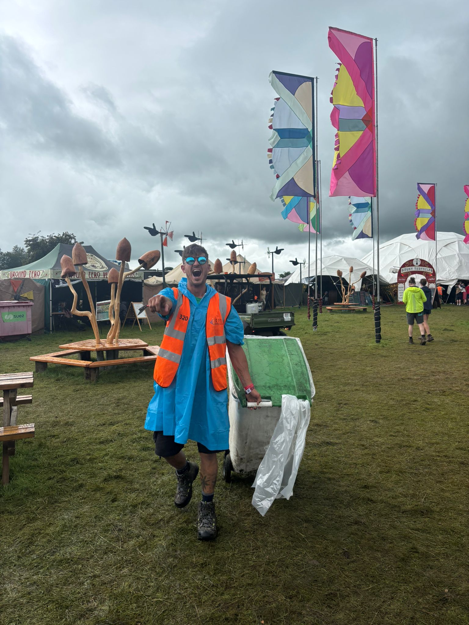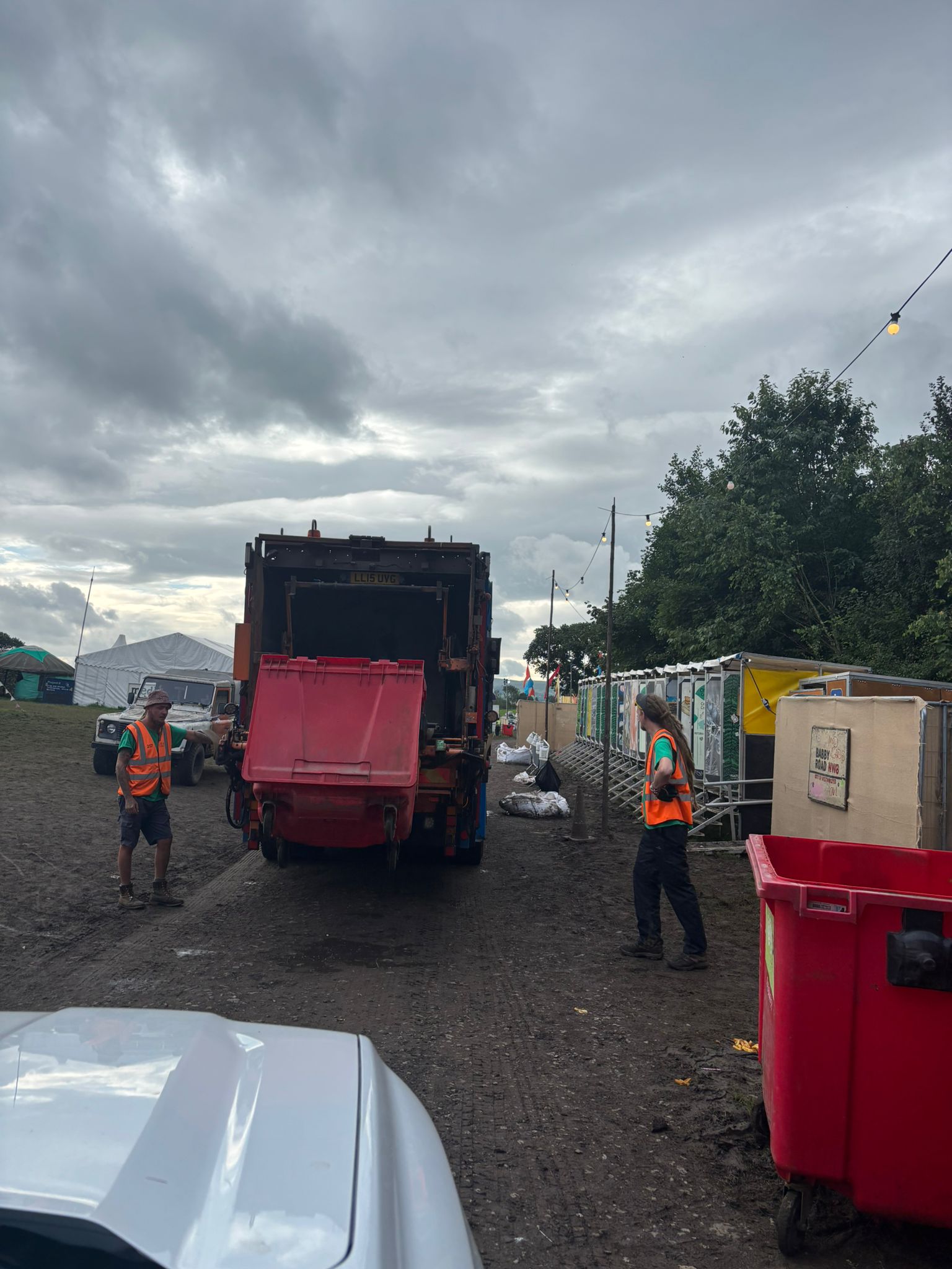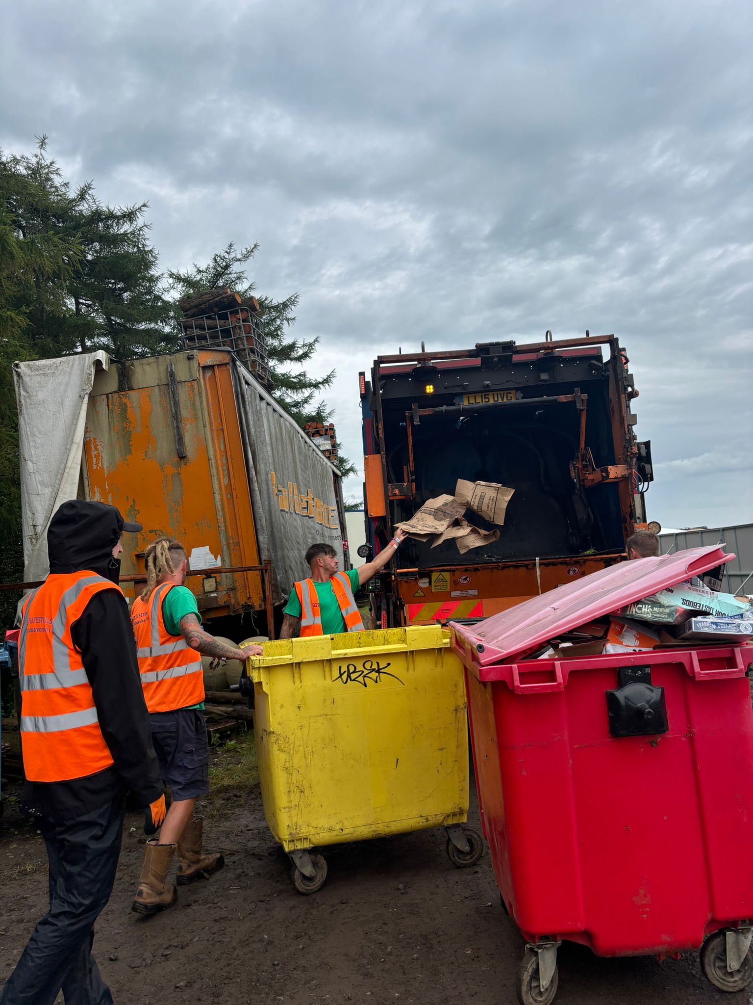After Picking Up The Confetti Bin Truck With Stage In Background Ian Loading Bin Truck Ian Pulling Bin Lauren & Tom Loading Bin Truck 1 Loading Bin Truck 2 Loading Bin Truck Matt Muddy Field Niklavs Picking Up Confetti Sade Sammi And Ian In Rain Macs Shane Infront Of Colourful Wall Statue With Bin Bag And Grabber The Fortress