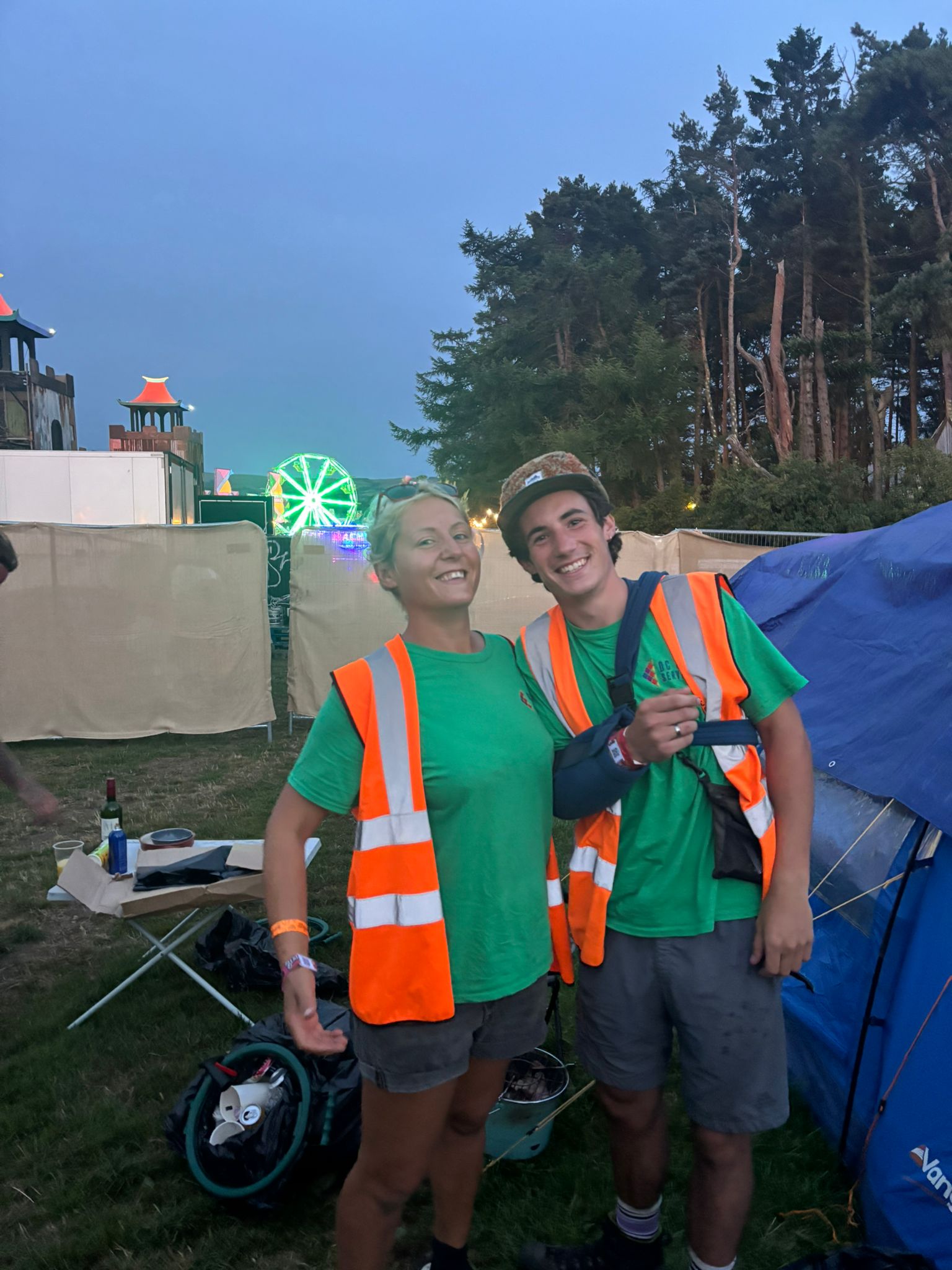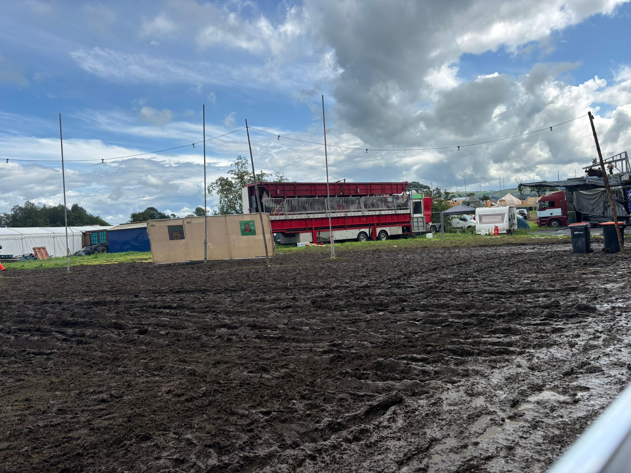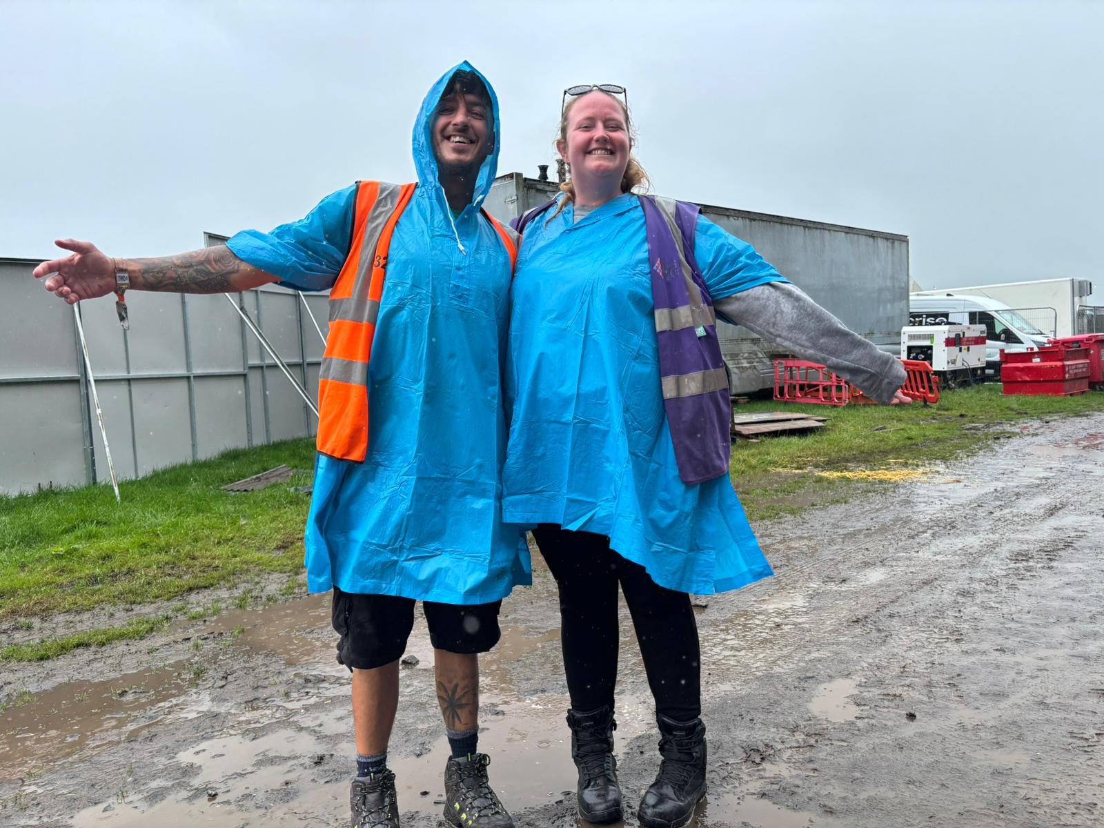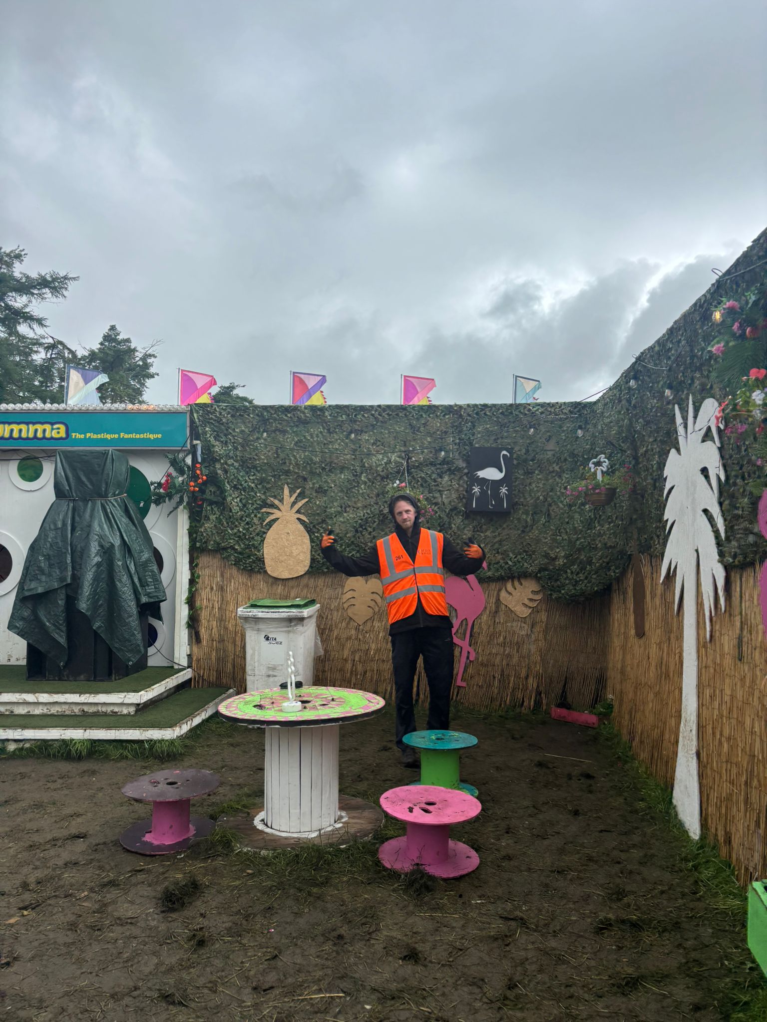 After Picking Up The Confetti Bin Truck With Stage In Background Ian Loading Bin Truck Ian Pulling Bin Lauren & Tom Loading Bin Truck 1 Loading Bin Truck 2 Loading Bin Truck Matt Muddy Field Niklavs Picking Up Confetti Sade Sammi And Ian In Rain Macs Shane Infront Of Colourful Wall Statue With Bin Bag And Grabber The Fortress