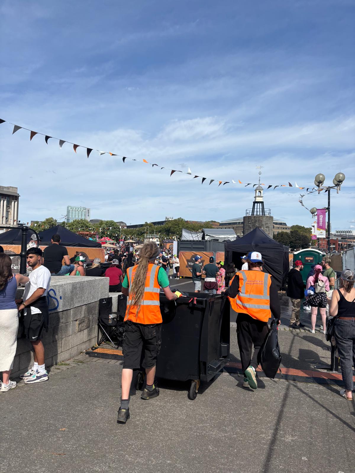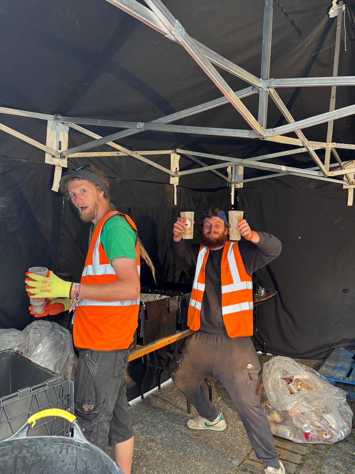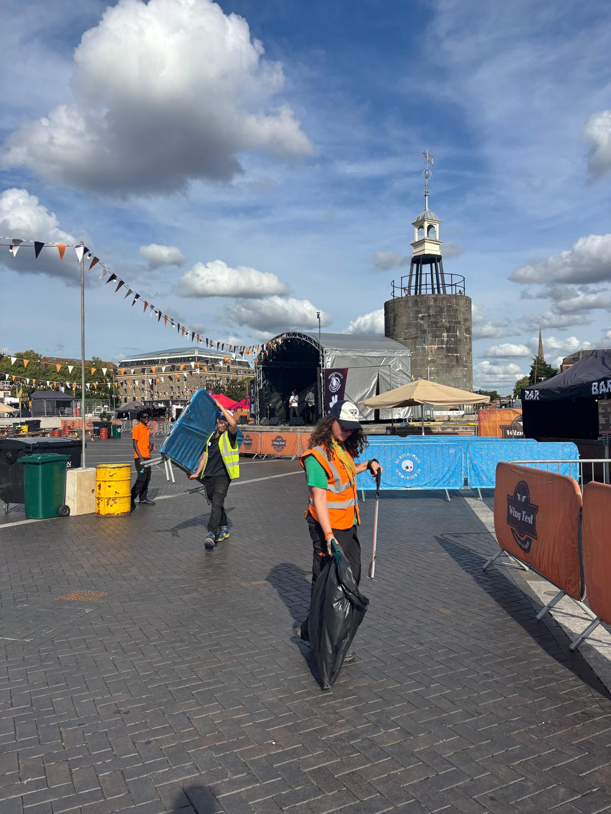 Crew Litter Picking John, Matt, Nathan And Olivia Posing By Sign Cropped Matt And Nathan Pushing Bin Nathan And Matt With Cups Olivia Litter Picking
